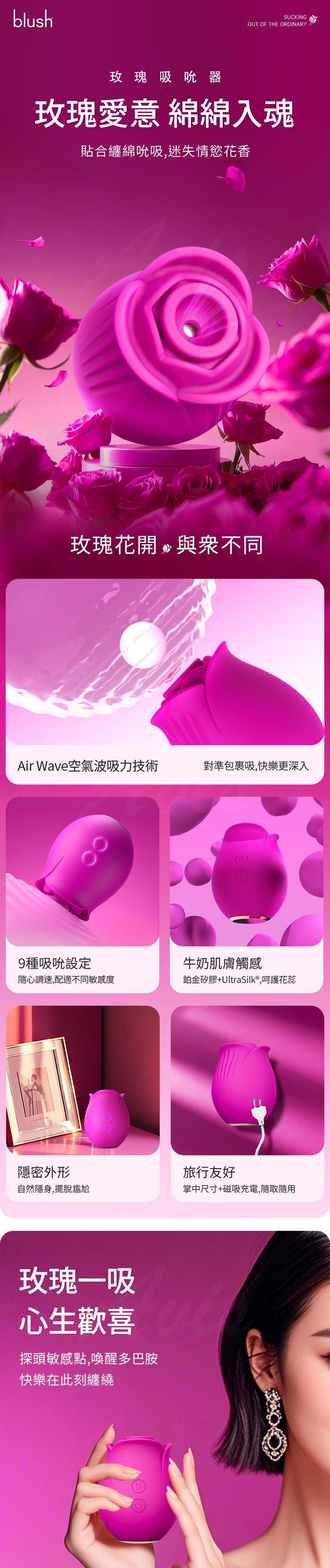 玫瑰輕啜,心底泛起漣漪。圓潤探頭尋覓敏感花蕊,輕輕一吸,喚醒多巴胺的悸動,讓快樂在此刻蔓延、纏繞。
